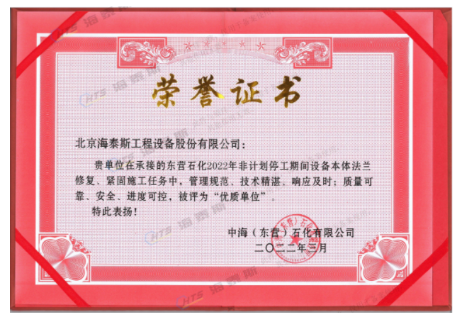 海泰斯獲評“優質單位”!負責的催化裝置、常減壓裝置泄漏法蘭的在線修復和定力矩緊固施工任務,實現了“零泄漏”的目標。
